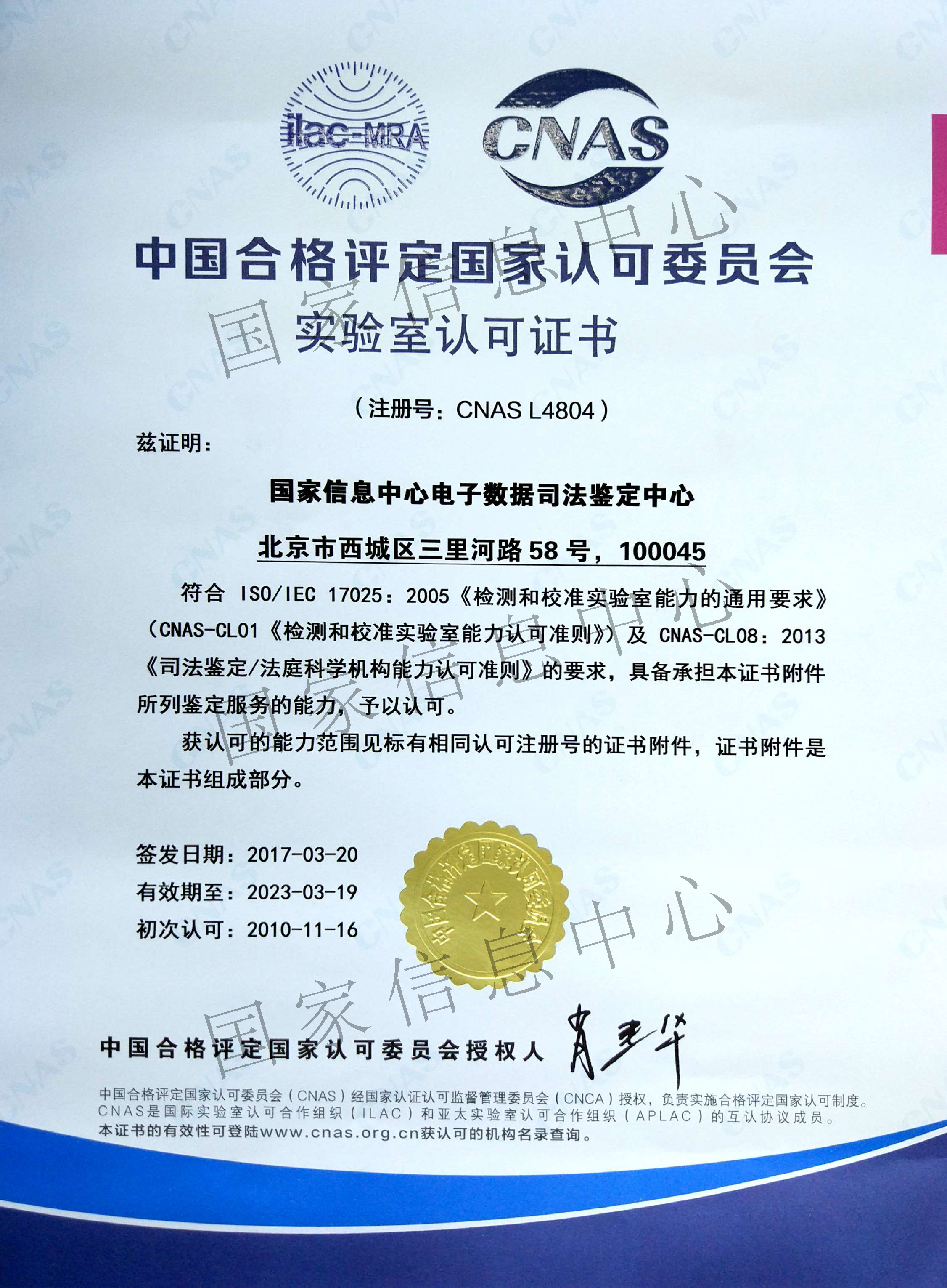 电子数据司法鉴定中国合格评定国家认可委员会实验室认可证书(CNAS)