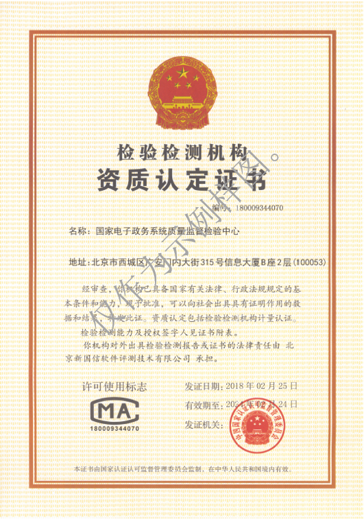 国家电子政务质检中心检验检测机构资质认定证书(CMA)