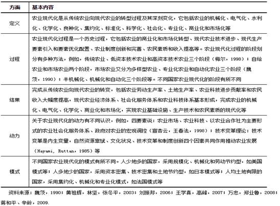 20世纪60年代以来,中国学者对农业现代化有大量研究和论著,除了少数学者(林毅夫,1992;温思美,1996)运用经济计量方法对我国农业改革进程中的制度与技术因素的贡献份额进行实证分析之外,大量的文献仍然属于思辨式的和政策性研究。徐更生较早地总结了农业现代化的历史经验及其对中国的启示;农业部农村经济研究中心课题组对我国传统农业向现代农业转变的研究指出:“农业现代化不仅仅是一个现代生产要素引入或技术进步的过程,同时更重要的是,它是一个要素优化配置的过程或制度创新的过程”。“它不仅包括生产技术的现代化,而且包括作为资源配置基础的农地经营制度、农产品价格形成制度、农产品营销制度、农业劳动力资源配置制度、农业金融制度及社区共同职能和政府管理农业职能等一系列基本制度的现代化”;温思美等对高新技术改造传统农业的理论与实现进行了研究(1996);朱玲讨论了处于转型期的政府对农业现代化的作用(1999);康芸、李晓鸣论述农业现代化的内涵和政策选择问题。此外,还有一些学者对农业现代化实践的评价指标体系进行研究(李大胜等,1999)。何传启在2010年著的《现代化科学:国家发达的科学原理》中,试图提出一种理论框架,集中表述经典农业现代化理论的基本观点(表1)