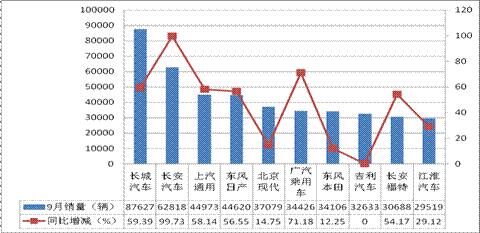 图1:2016年9月全国SUV企业销量前十企业