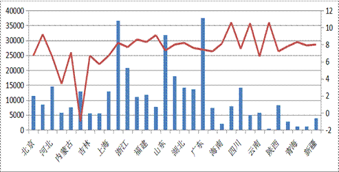 从各地区GDP增速看,超过10%的有重庆(10.6%)、西藏(10.6%)和贵州(10.5%),在8%--9.2%之间的有10个地区,还有7个地区的经济GDP增速快于地区合计水平,低于地区合计水平的有10个地区,除了北京和上海两大直辖市外,其他基本上为产业结构重型化或比较单一的地区,其中辽宁成为唯一一个负增长的省份。而南方特别是沿海省市转型起步较早,经济已开始回稳,由此带来南北省区的经济增长出现分化。