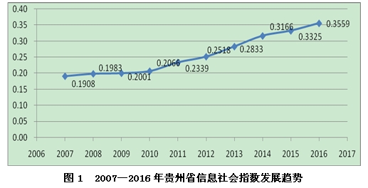 在发展趋势上,自2007年以来贵州信息社会指数总体呈现不断上升趋势(如图1所示),指数由2007年的0.1908提高到2016年的0.3559,增加了0.1651,年均复合增长率为7.17%,高于全国(6.5%)0.67个百分点,表明贵州信息社会正在加速发展,发展速度高于全国平均水平。