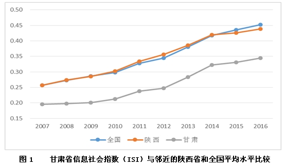 从信息社会建设速度看,已进入加速发展的快车道。甘肃省2010年ISI 指数为0.2122,与2007年相比,年均增长2.77%,比全国同期增幅低2.38个百分点,比陕西省同期增幅低2.81个百分点。2011~2016年,甘肃省ISI指数从0.2379快速提升到0.3446,年均复合增长速度达到7.7%,高于同期陕西省2.1个百分点;也高于同期全国平均水平1个百分点,增速列全国第3位,信息社会转型步伐开始加快。