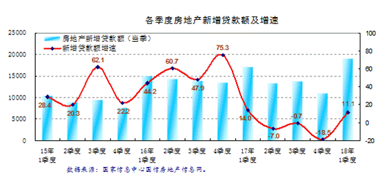 房地产贷款总体增速保持回落,房产和地产开发贷款增速上升,个人住房贷款增速回落。截止2018年3月末,全国主要金融机构(含外资)房地产贷款余额为34.1万亿元,同比增长20.3%,增速比上季末低0.6个百分点。其中,个人住房贷款余额为22.86万亿元,同比增长20%,增速比上季末低2.2个百分点;房产开发贷款余额为7.7万亿元,同比增长25.3%,增速比上季末高3.6个百分点;地产开发贷款余额为1.4万亿元,同比增长2.2%,降幅比上季末增加10.2个百分点。