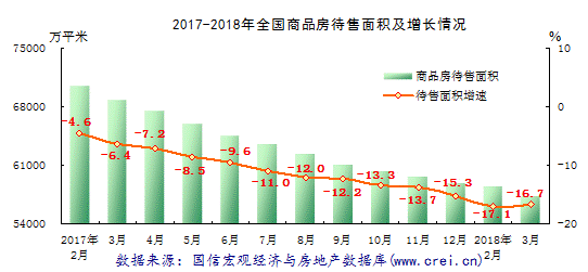 与销售面积增速放缓相对比,商品房待售面积的降幅开始略有收窄。截至2018年3月末,全国商品房待售面积为5.73亿平方米,连续15个月保持下降,同比下降16.7%,降幅与2018年2月相比收窄0.4个百分点,表明持续近两年的“去库存”政策,其政策力度将有所减弱,以保持市场的平稳增长。从商品住宅待售面积来看,基本与商品房待售面积走势类似,3月末为2.92亿平方米,同比下降25.4%,降幅较2月份收窄0.6个百分点。
