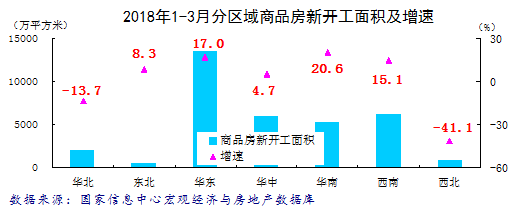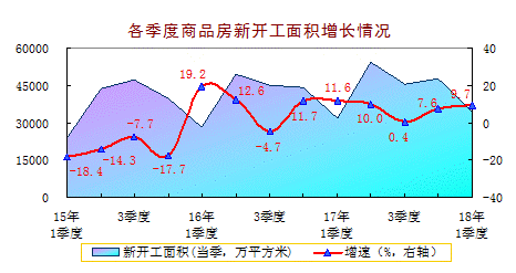 2018年1季度,全国商品房新开工面积为34615万平方米,增长9.7%,增速较上一季度提高2.1个百分点。其中,商品住宅新开工面积为25531万平方米,增长12.2%,比上一季度加快3.4个百分点。