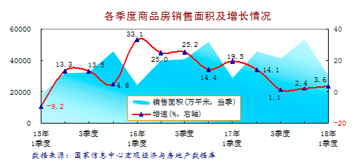 2018年1季度,全国商品房实现销售面积30088万平方米,同比增长3.6%,增速与2017年全年相比回落3.9个百分点,但与上一季度当季增速相比加快1.2个百分点。其中,商品住宅实现销售面积26114万平方米,增长2.5%,增速与2017年全年相比回落2.8个百分点,但与上一季度相比加快2.1个百分点。