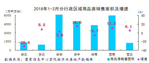 第四,区域分化特征仍将延续。从2018年一季度各区域房地产运行情况的分析,发现各项指标中均有部分区域出现负增长,部分指标跌幅还比较明显,这表明始于2013年的城市分化趋势仍在延续,未来仍将继续。从各区域的增长情况来看,华北地区延续调整,东北地区仍较为低迷,华东地区稳中有升,华中地区销售后劲减劲,华南地区投资增长可期,西南和西北地区房价上涨压力值得重视。