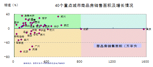 分城市看,有25个城市商品房销售面积保持增长,其余15个城市下跌。在上涨的城市中,乌鲁木齐、郑州、南宁、太原、长春等城市增幅较大,均超过20%,这些城市均位于中西部地区。在下跌的城市中,北京、天津、广州、石家庄、兰州等城市间降幅较大,跌幅均超过30%以上。