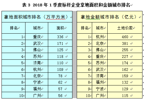 分城市看,一二线城市仍为房企投资拿地的重心。2018年1-3月,重庆、郑州、武汉占据标杆企业拿地面积的前三位,分别拿地336、204和171万平方米。从拿地总价款来看,杭州跃居第1位,以460亿元雄居榜首,北京则以381亿元位居第2位。佛山则由于万科、保利、恒大、中海、碧桂园等房企的强势进入,拿地总价款占据第3位。